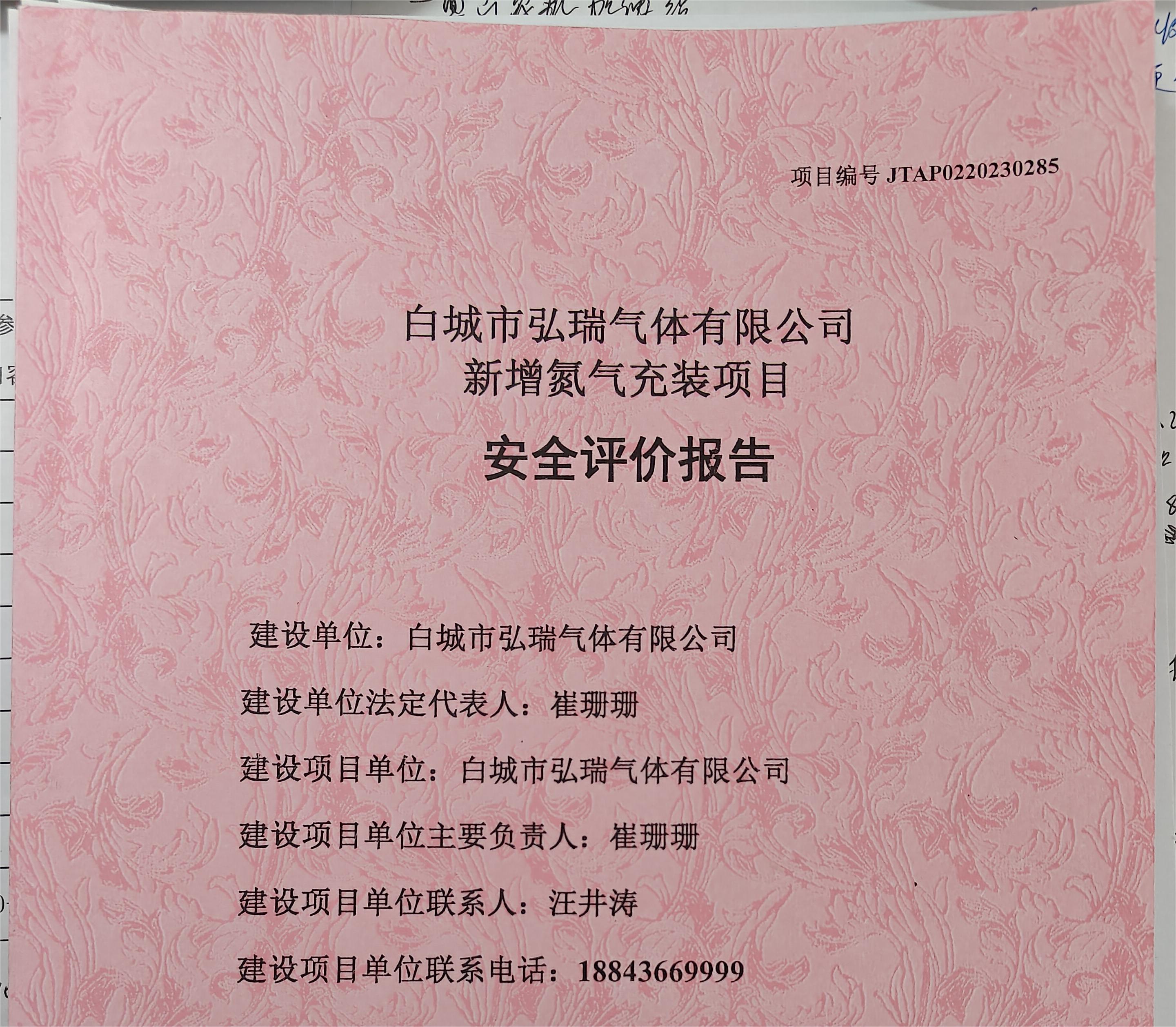 JTAP0220230285-白城市弘瑞氣體有限公司新增氮氣充裝項目安全預(yù)評價
